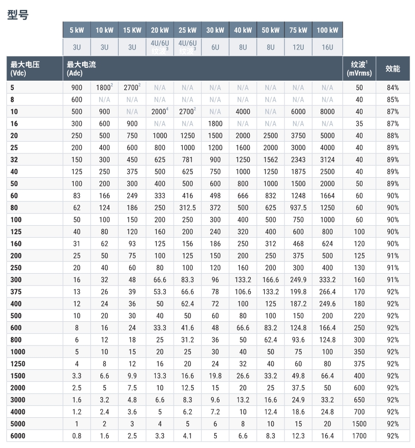 TS系列提供多種型號(hào),涵蓋廣泛的電壓和電流范圍,同時(shí)仍保持最高功率密度的機(jī)架安裝式封裝。TS 系列涵蓋從5Vdc 到 6000 Vdc(浮動(dòng))的電壓和從1.2Adc到8000Adc的電流水平。5kw到15kW型號(hào)有3U機(jī)箱,20kW和25 kw型號(hào)有4U機(jī)箱,30kW型號(hào)有6U機(jī)箱,40 kW和50 kW型號(hào)有可拆卸8U機(jī)箱腳輪,型號(hào)75kw型號(hào)可用于帶可拆卸腳輪的12U 機(jī)箱,100 kw 型號(hào)可用于帶可拆卸腳輪的 16U機(jī)箱。此外還有幾種特殊的低壓大電流型號(hào),可為這些要求提供更具成本效益的解決方案。所有TS系列電源均標(biāo)配隔離式37針外部1/0RS232遠(yuǎn)程接口軟件IV驅(qū)動(dòng)程序和LabVIEW 驅(qū)動(dòng)程序,以便集成到各種編程環(huán)境中
