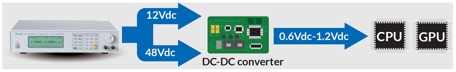 以CPU及GPU供電順序來看,多數(shù)是由12V或是48V經(jīng)過DC-DC轉(zhuǎn)換器,降為0.6V至1.2V給CPU及GPU的電源使用,在DC-DC轉(zhuǎn)換器前端可以參考Chroma 62000P系列,具有40V/120A/1,200W及80V/60A/2,400W輸出能力適合選用,其DC-DC模塊輸出電壓范圍約在0.6V至1.2V,63202 -20具有20V、1,000A或2,000A、2,000W帶載能力,特別適合低壓大電流等相關(guān)測試。
