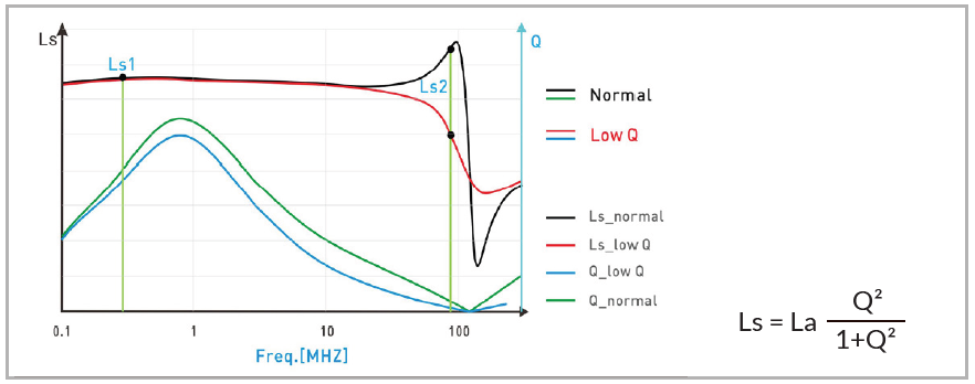 電感在高頻的等效電路與Ls與Q的關(guān)系式如(圖一),一般業(yè)界雖以接近電感自振頻率(SRF)之Ls在檢測前述品質(zhì)異常,實質(zhì)上是在檢測其Q值是否低下,但可避開接觸電阻影響。一般正常品在SRF附近Ls因寄生容量關(guān)系較高,異常品則受損失過大所累Q值低下,表象Ls也偏低。 Chroma11090-030 100kHz~300MHz測試頻域滿足標稱Ls/Q與高頻Ls@HF的雙重測試需求,可滿足此類電感在生產(chǎn)的使用需求,另外在其RD與品保或電感使用者都很適用。