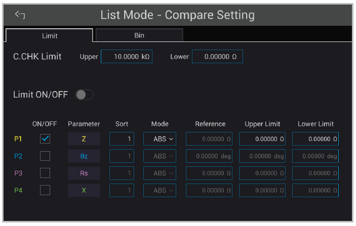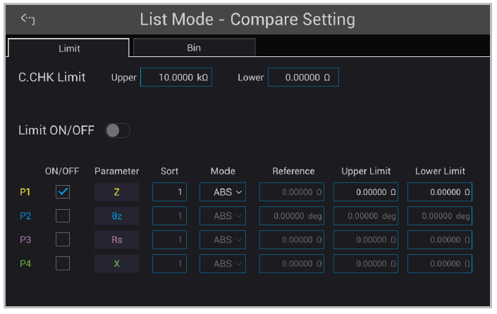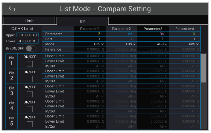 射頻測試在不同頻域的良品或不良品判定可能因其參數(shù)不同,使用絕對值或百分比不同、注重之主副參數(shù)不同、高低判定方式也不同。 Chroma 11090-030提供非常具彈性的表列式,且最多達13 bins,每個bin有四個限制值。頻率和測量參數(shù)等條件可以在每列中獨立設(shè)置,使11090-030能夠滿足多樣性的分選需求,包括不同測量頻率下的不同參數(shù)。