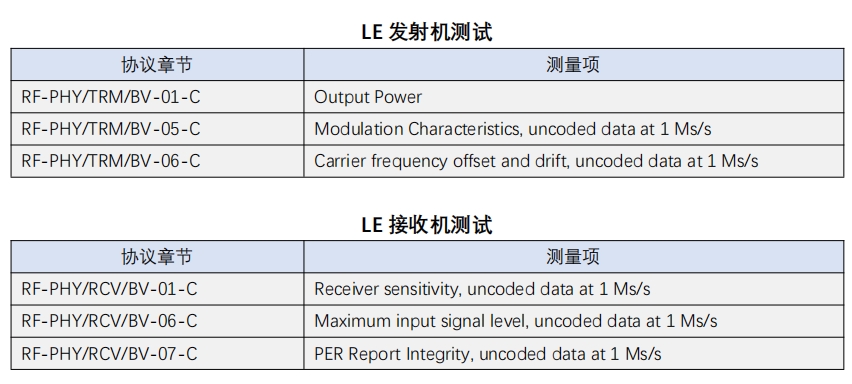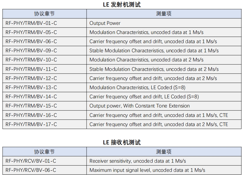ITC-RT650 提供 LE 射頻測試功能,支持如下測量項。