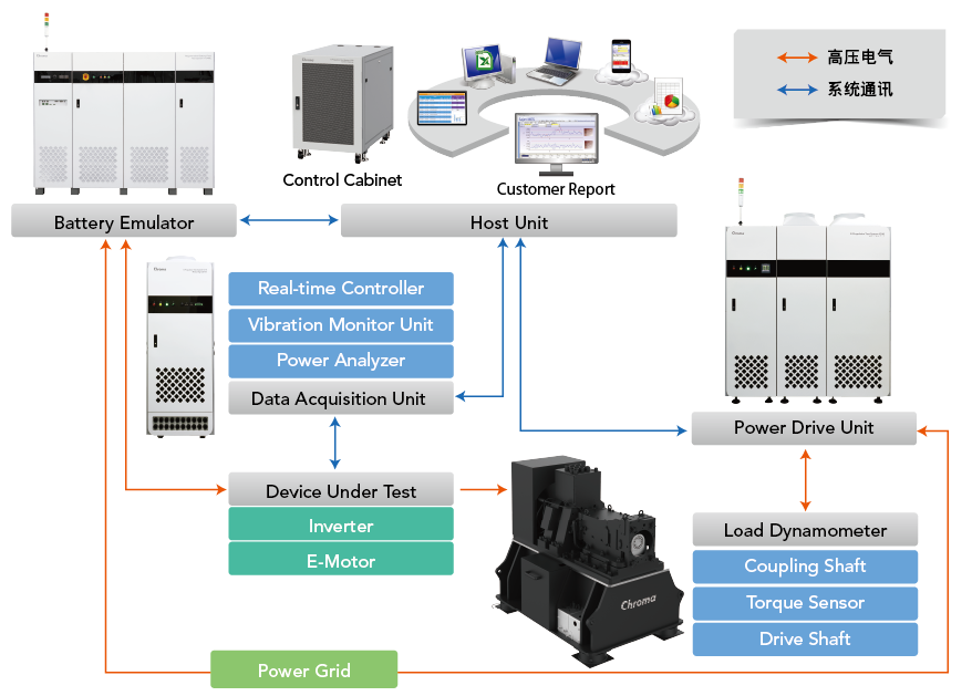 Chroma 1210電驅(qū)動(dòng)總成測(cè)試系統(tǒng)主要用于車用動(dòng)力系統(tǒng)的性能標(biāo)定及驗(yàn)證,具有載入整車動(dòng)態(tài)模型用于機(jī)械部件的系統(tǒng)仿真驗(yàn)證的能力,系統(tǒng)操作采手動(dòng)或程序控制等方式,并可同步記錄電壓、電流、功率、轉(zhuǎn)速、扭矩、溫度等物理量參數(shù)。測(cè)試中所產(chǎn)生的電力透過(guò)Chroma 雙向直流電源17040系列及62000D系列能源回收裝置回饋到市電,并使用電池模擬之功能,即時(shí)模擬車輛運(yùn)行時(shí)電池的反應(yīng)特性,增加驗(yàn)證的可靠度。