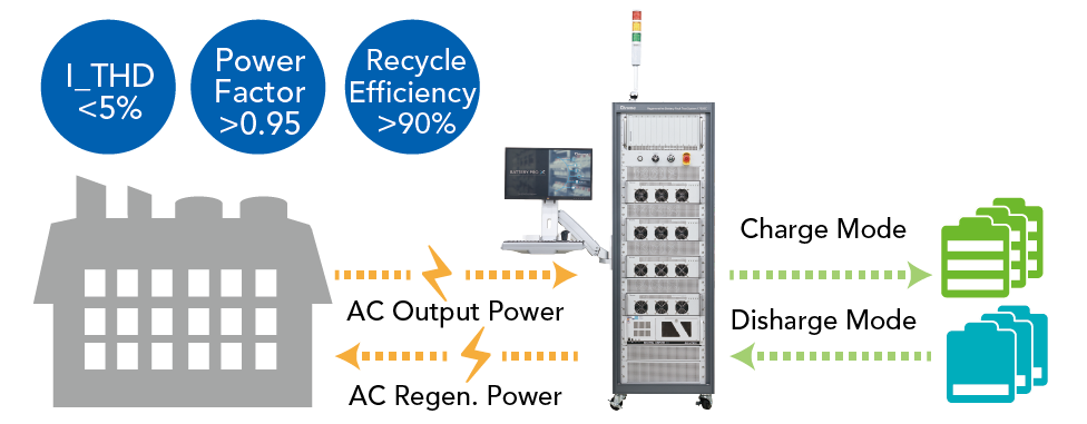 該系統(tǒng)可將電池模塊放電過程中釋放的電能回收,并將其回送至其他充電信道的電池模塊或回流至市電電網(wǎng),從而節(jié)省電力并降低熱能產(chǎn)生。